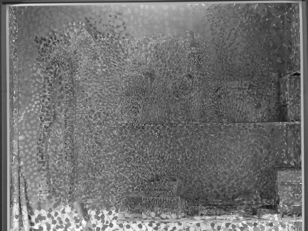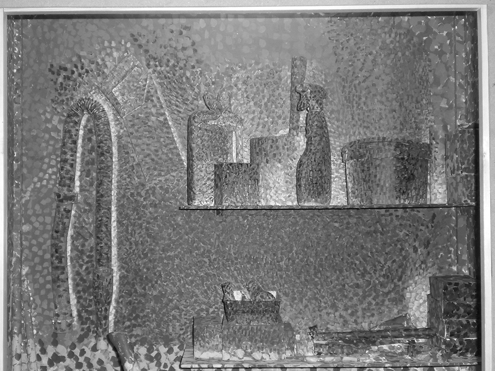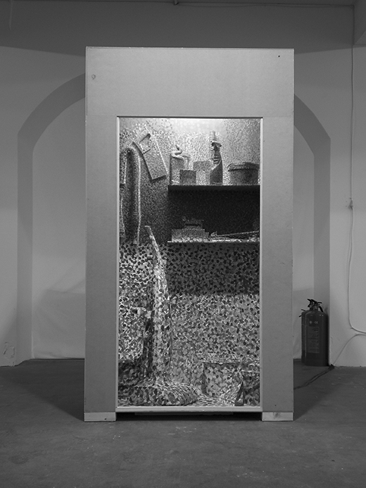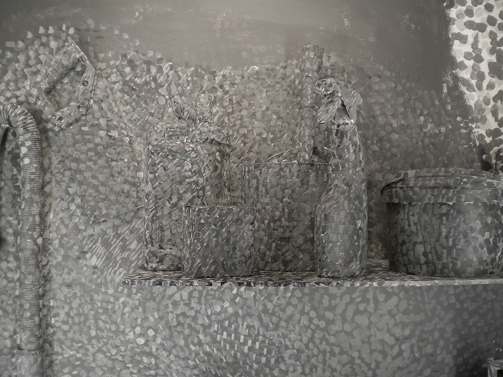 Ein Putzschrank ist mit impressionistischem Pinselduktus derart bemalt, dass die sich darin befindenden Gegenstände bei einer bestimmten Beleuchtung verschwinden. Beim Ausschalten der integrierten Lampe erscheint das Stilleben als Negativbild.