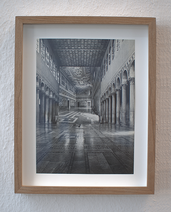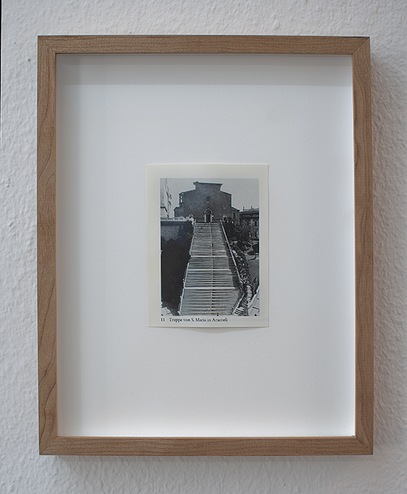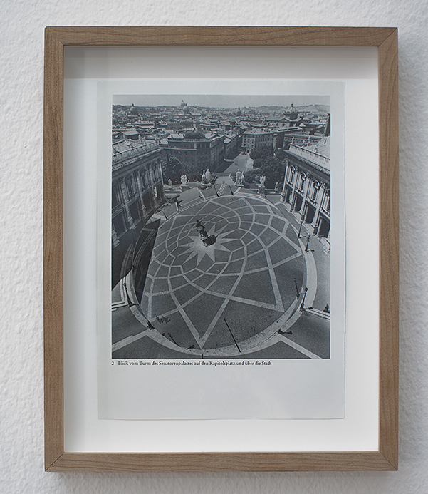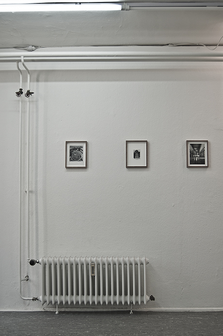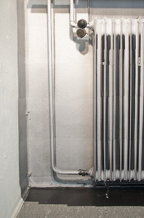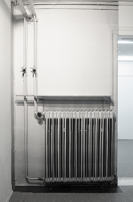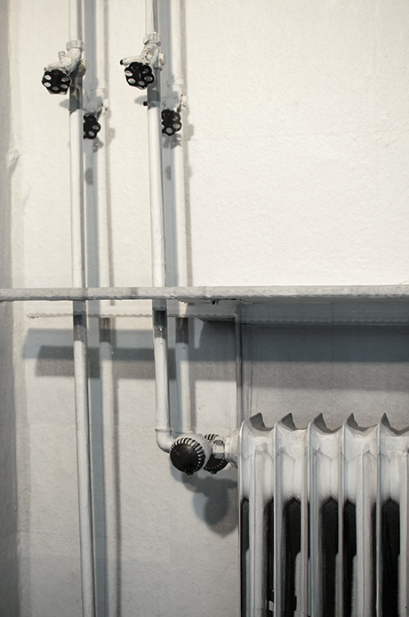 Sinta Werner’s work “Maßnahme des Vermessens (Measure of Measuring)” interferes with the space by playing with its imperfection. For her wall installation, the artist has chosen a corner which is, at first glance, not the most appropriate for hanging, being occupied with pipes and a radiator.